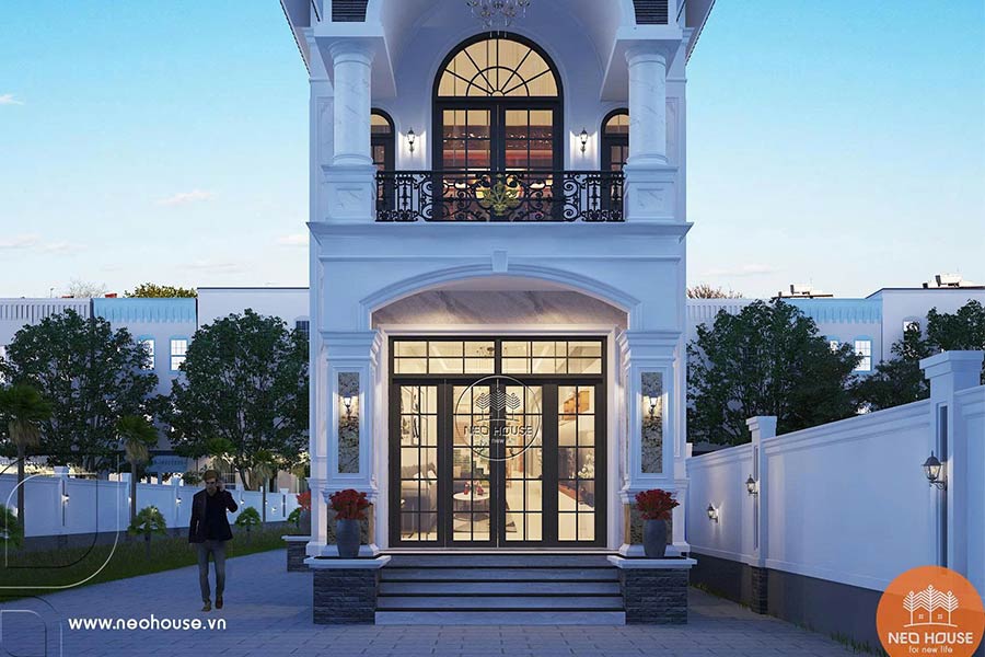 Mặt tiền chính là điểm điểm nhấn chính của ngôi nhà với tầng một nổi bật với sảnh chính bề thế, cột vuông ốp đá hoa cương sang trọng và bậc tam cấp lát đá đen. Giúp tổng thể mặt tiền trở nên sang trọng và thu hút hơn. Cửa chính của ngôi nhà 2 tầng 5x17m tân cổ điển sử dụng kính cường lực khung đen vừa mang tính hiện đại, vừa giúp nội thất thêm phần thoáng đãng. Hai bên sảnh được tô điểm bằng đèn tường cổ điển, tạo cảm giác ấm cúng và thanh lịch. Trên lầu hai, ban công vòm bán nguyệt kết hợp cùng cột tròn cân đối, lan can sắt mỹ thuật uốn lượn mềm mại, góp phần tôn lên vẻ duyên dáng đặc trưng của phong cách tân cổ điển.