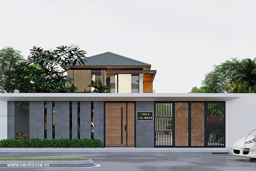 Cổng chính của ngôi nhà được thiết kế với gam trắng tinh tế kết hợp xám ghi hiện đại, tạo nên diện mạo sang trọng, vững chãi. Phần cửa cổng sử dụng sắt sơn tĩnh điện chắc chắn, kết hợp ốp nhựa ngoài trời vân gỗ bền đẹp, vừa chống thấm vừa giữ được vẻ sang trọng theo thời gian. Điểm nhấn của hệ tường rào là những thanh lam xây dựng kiên cố kết hợp cùng các khung sắt dọc được bố trí nhịp nhàng. Sự phối hợp này vừa tạo nên vẻ hài hòa với kiến trúc biệt thự, vừa giữ được sự thông thoáng, đón ánh sáng và gió tự nhiên cho không gian bên trong. Tổng thể cổng và tường rào mang đến cảm giác rộng rãi, bề thế, vừa đảm bảo an toàn, riêng tư tuyệt đối, vừa nâng tầm giá trị thẩm mỹ cho toàn bộ căn biệt thự.